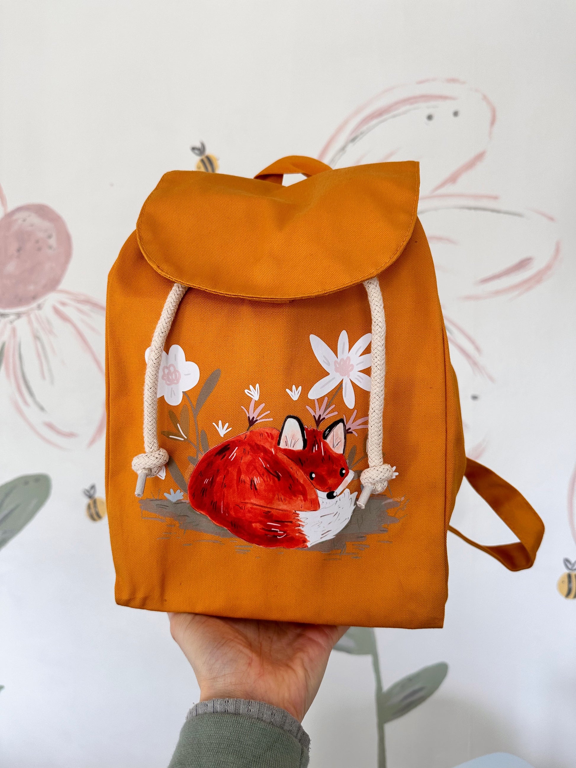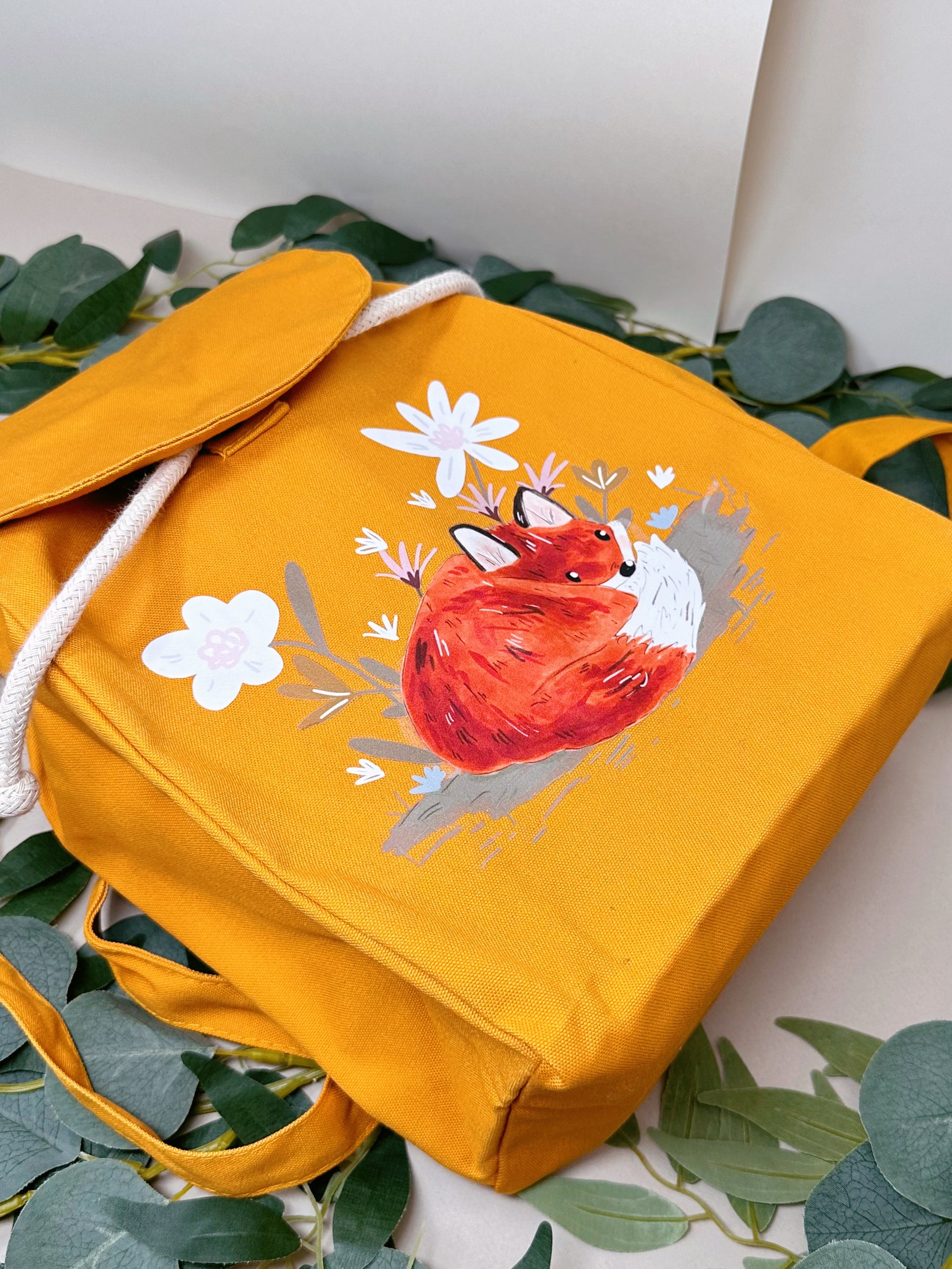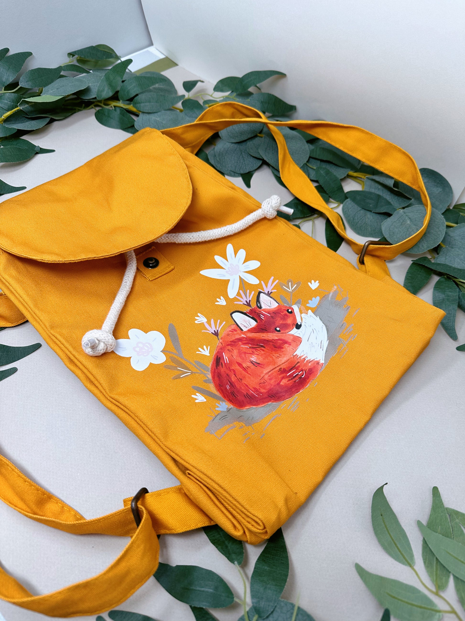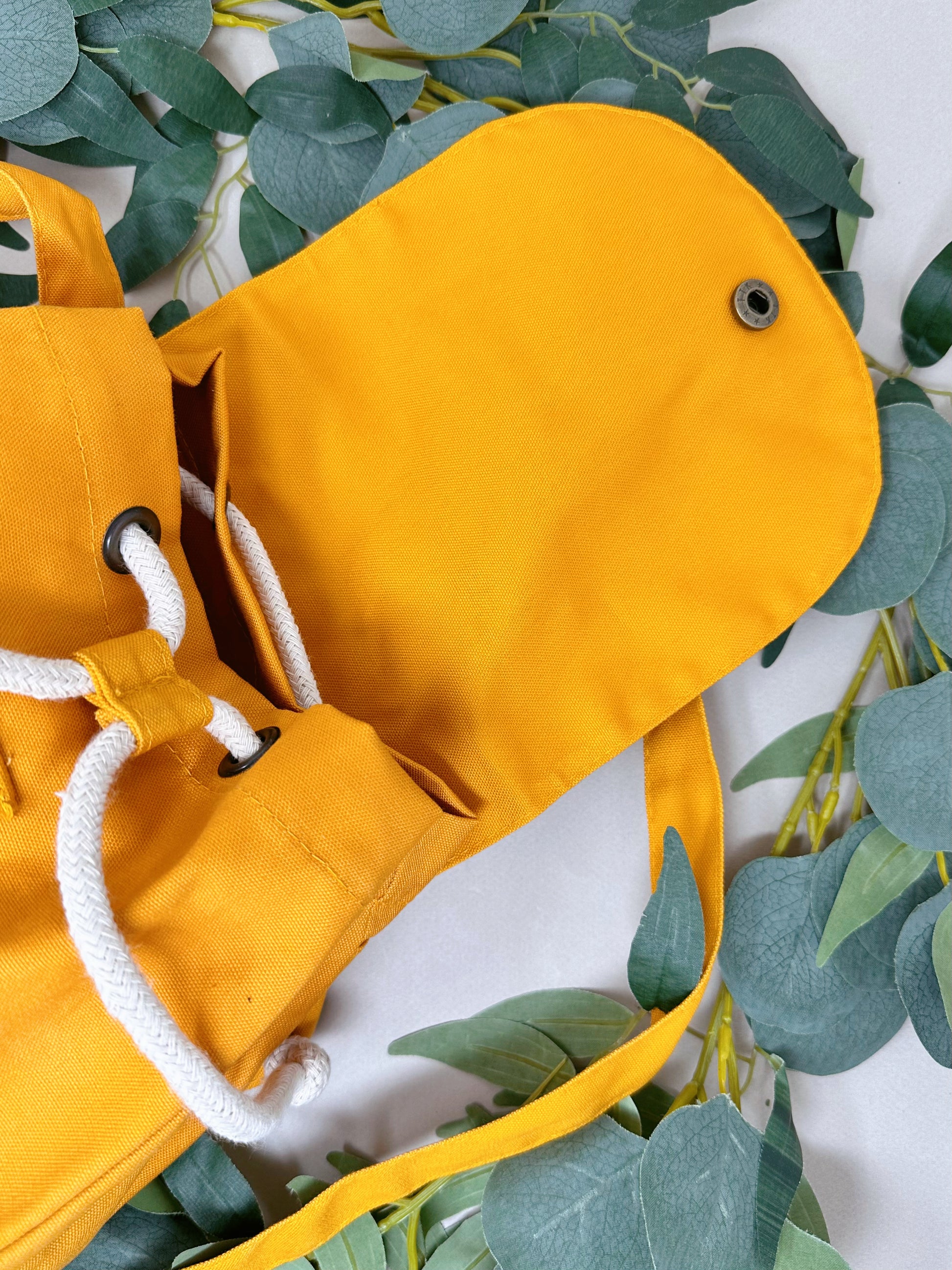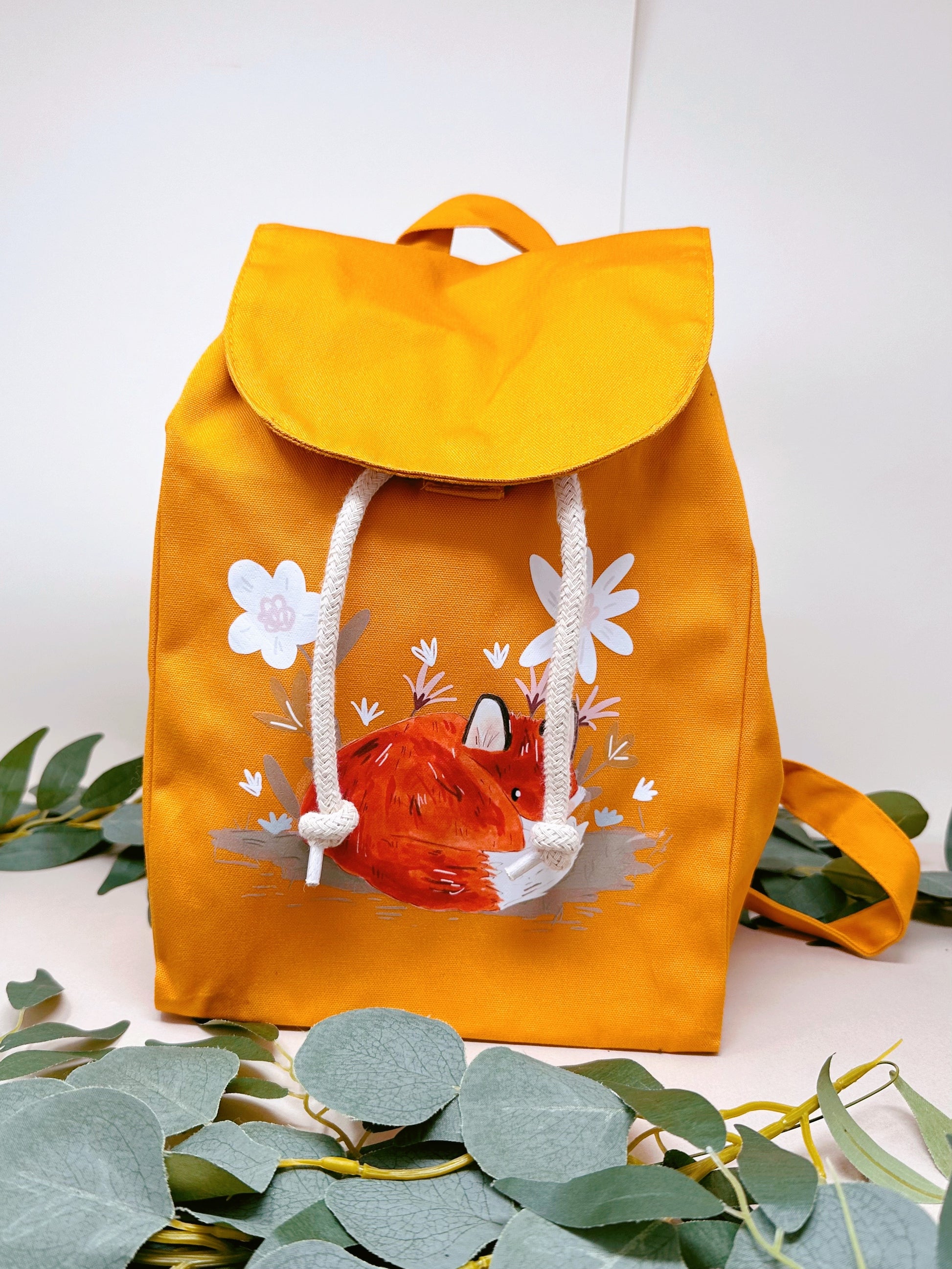 The bag is made from 100% organic cotton and has fully adjustable shoulder straps, rope drawstring closure