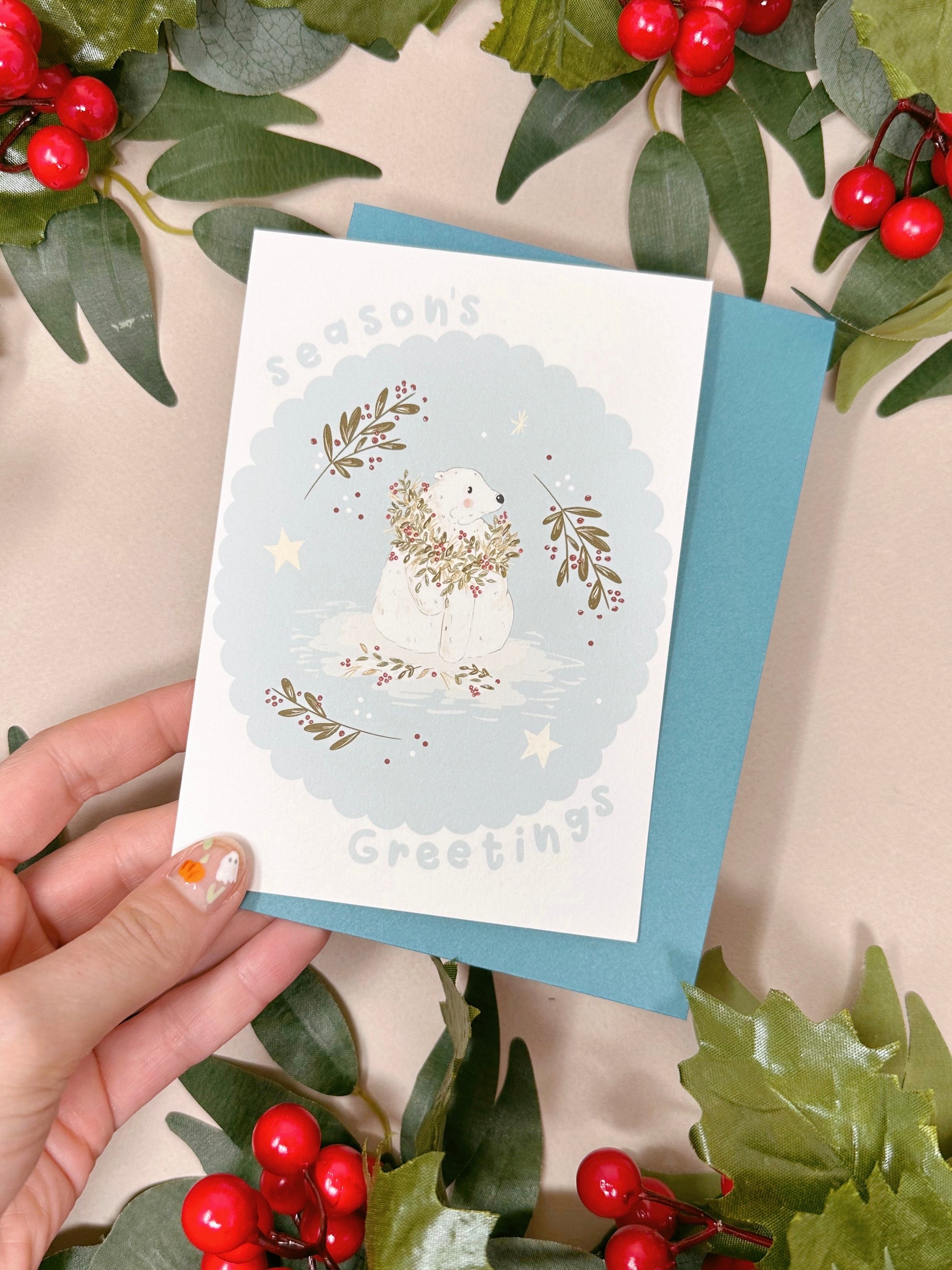 Polar Bear Holly Christmas Card