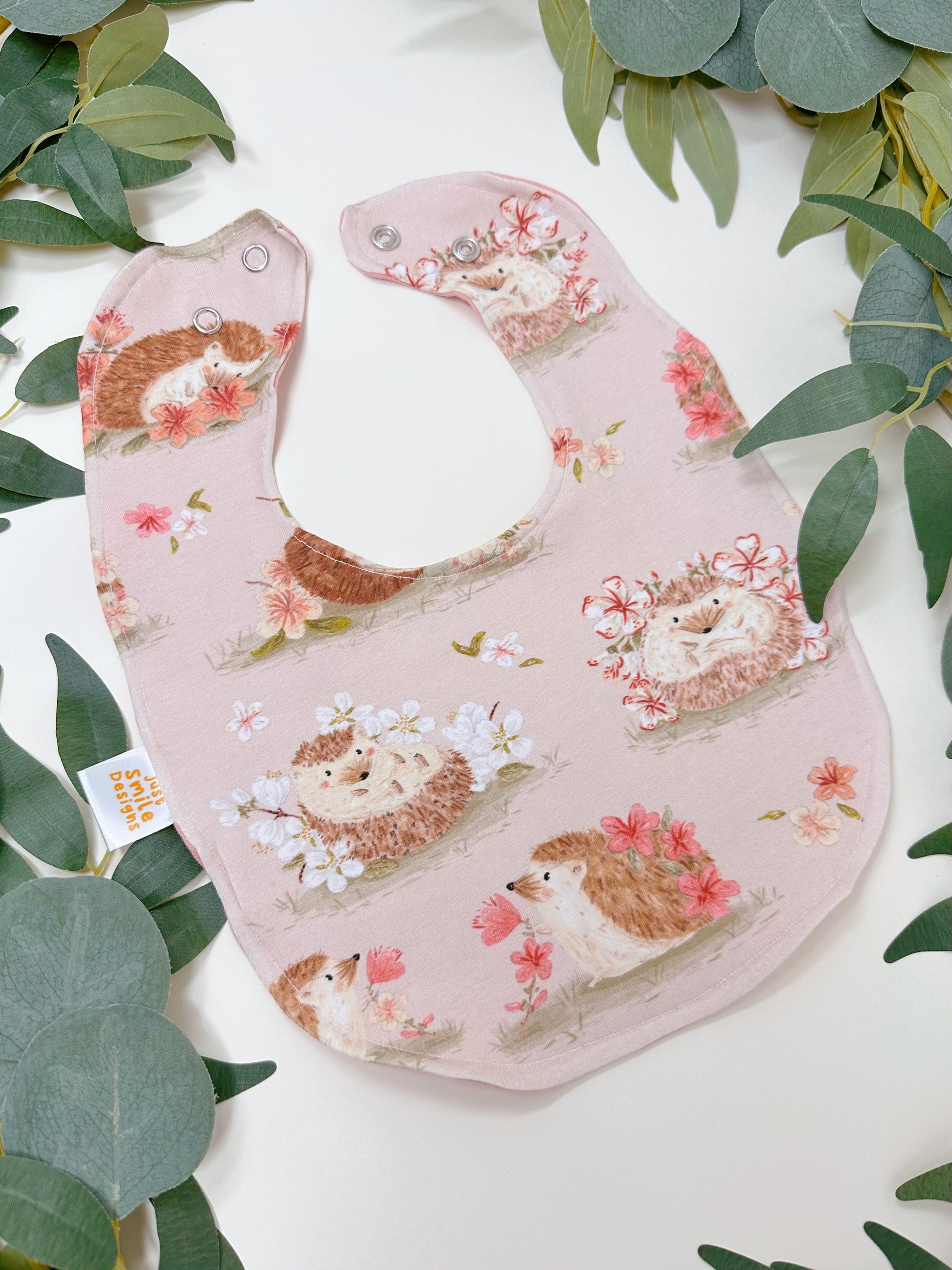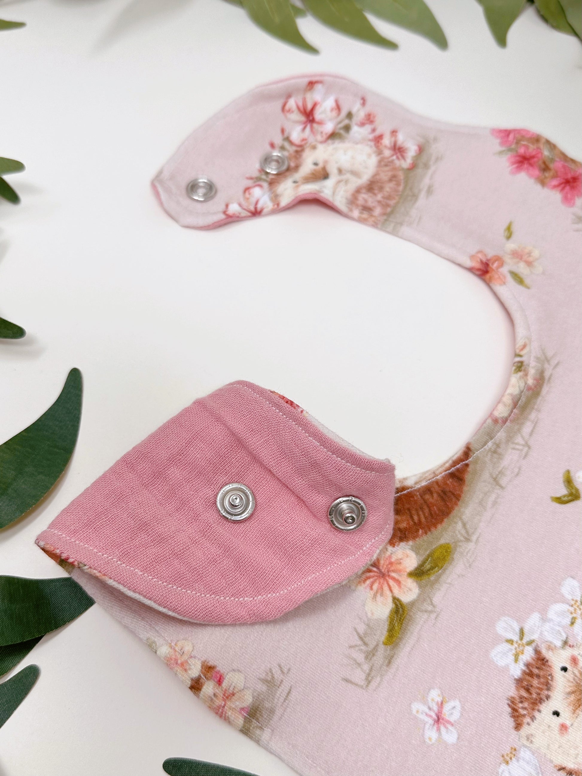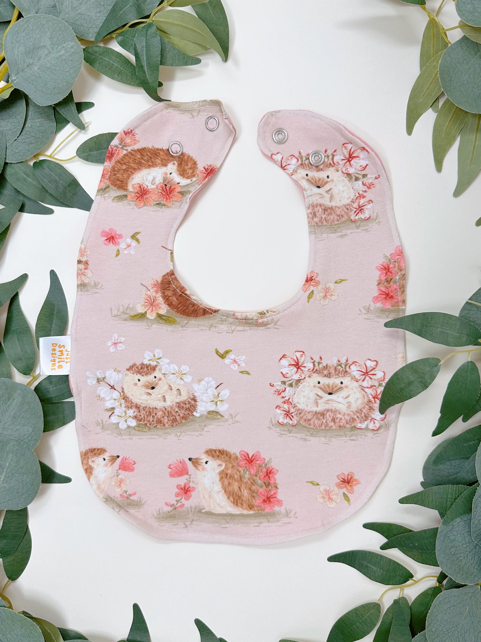 The fabric designs are all mine from original drawings. Each bib will differ in pattern as it’s cut from my floral material.