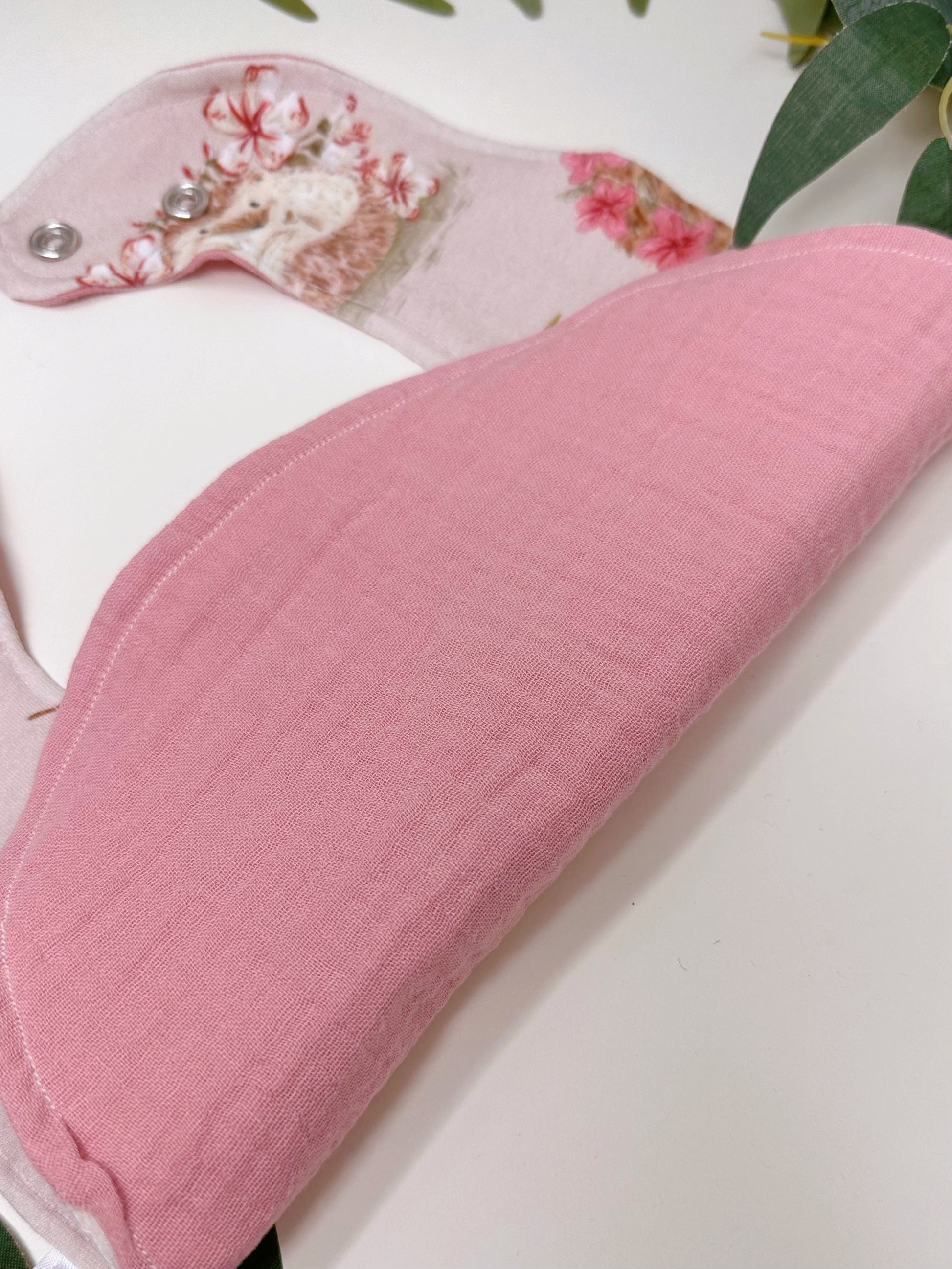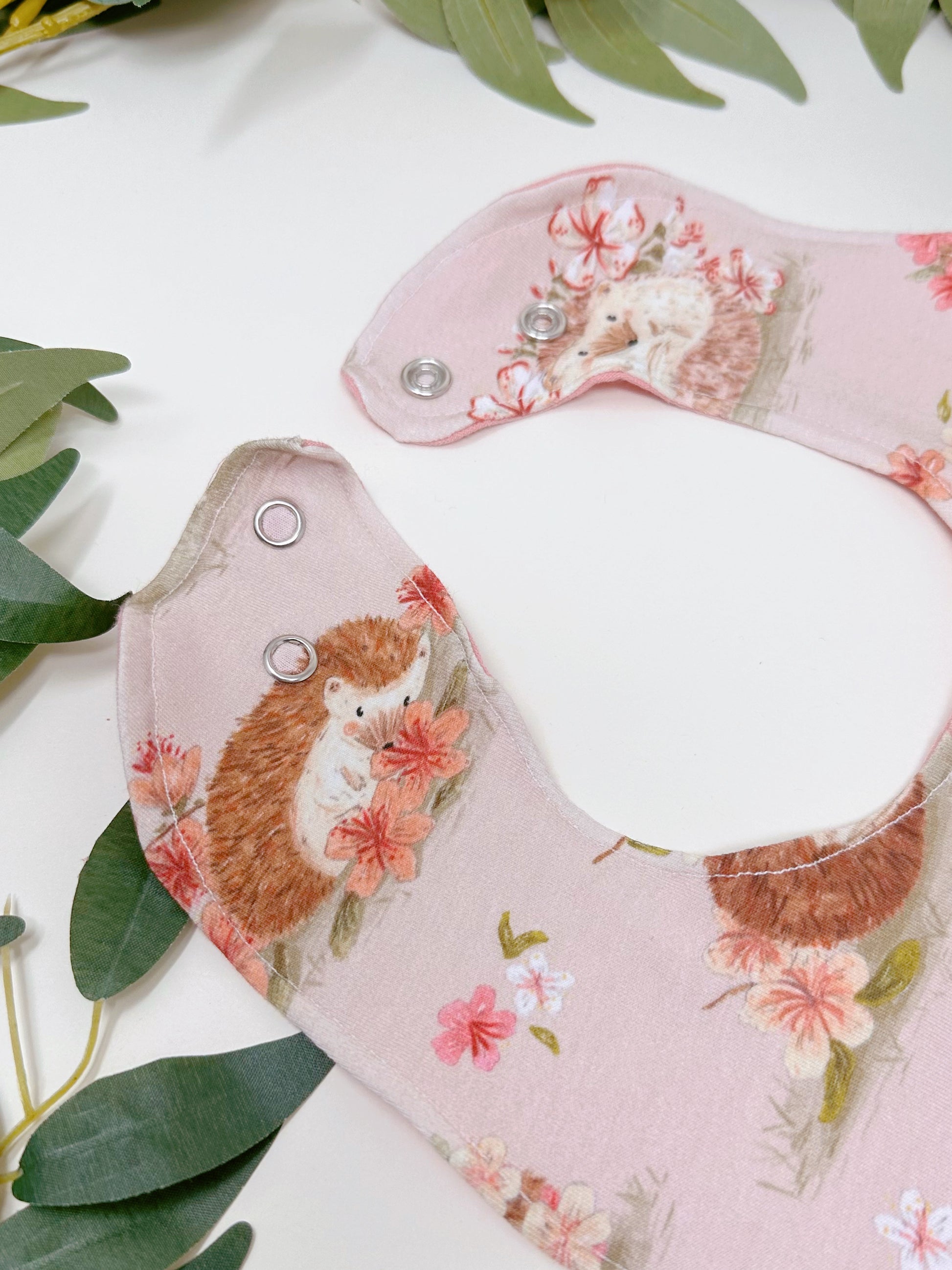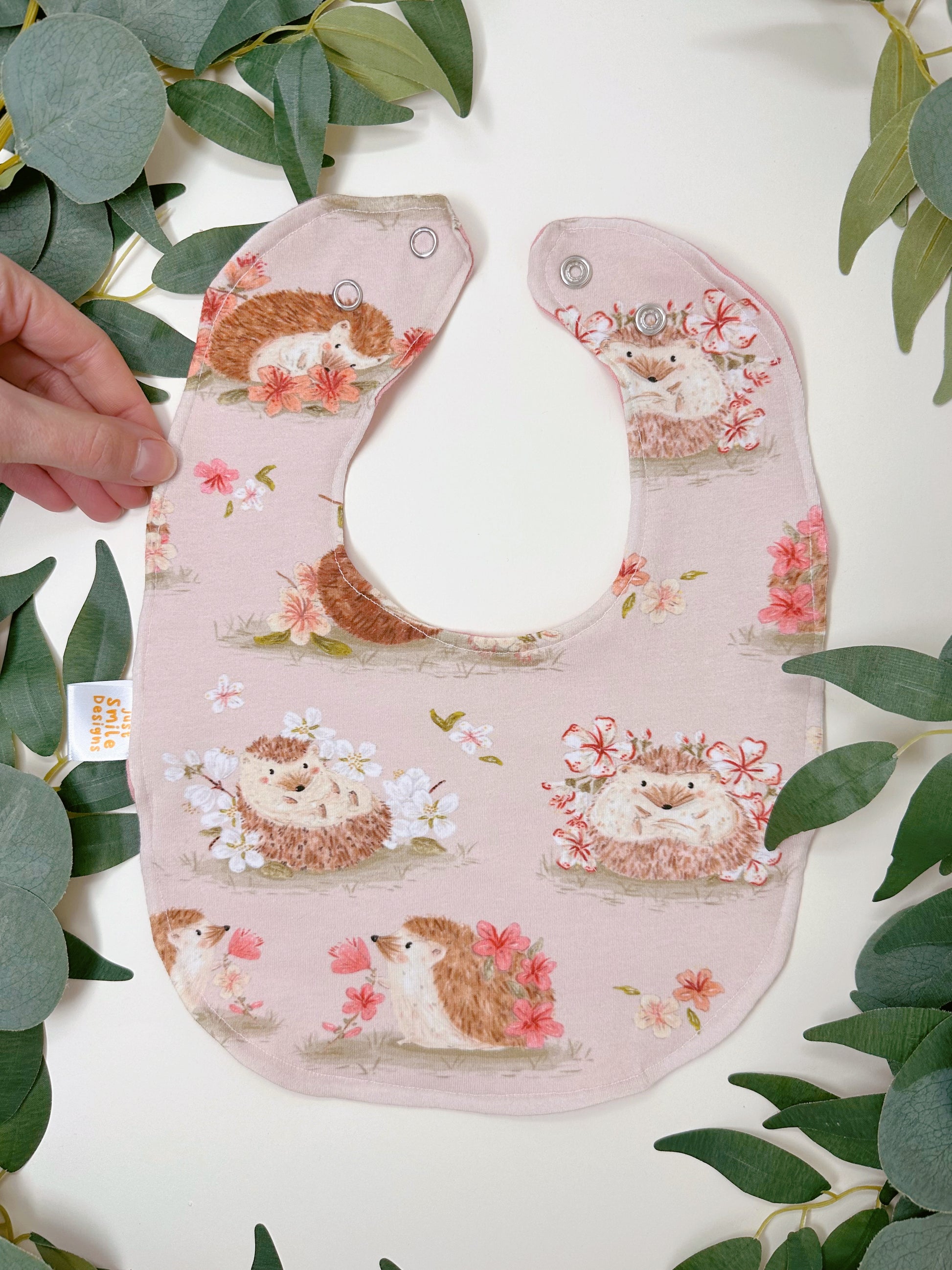 The fabric designs are all mine from original drawings. Each bib will differ in pattern as it’s cut from my floral material.